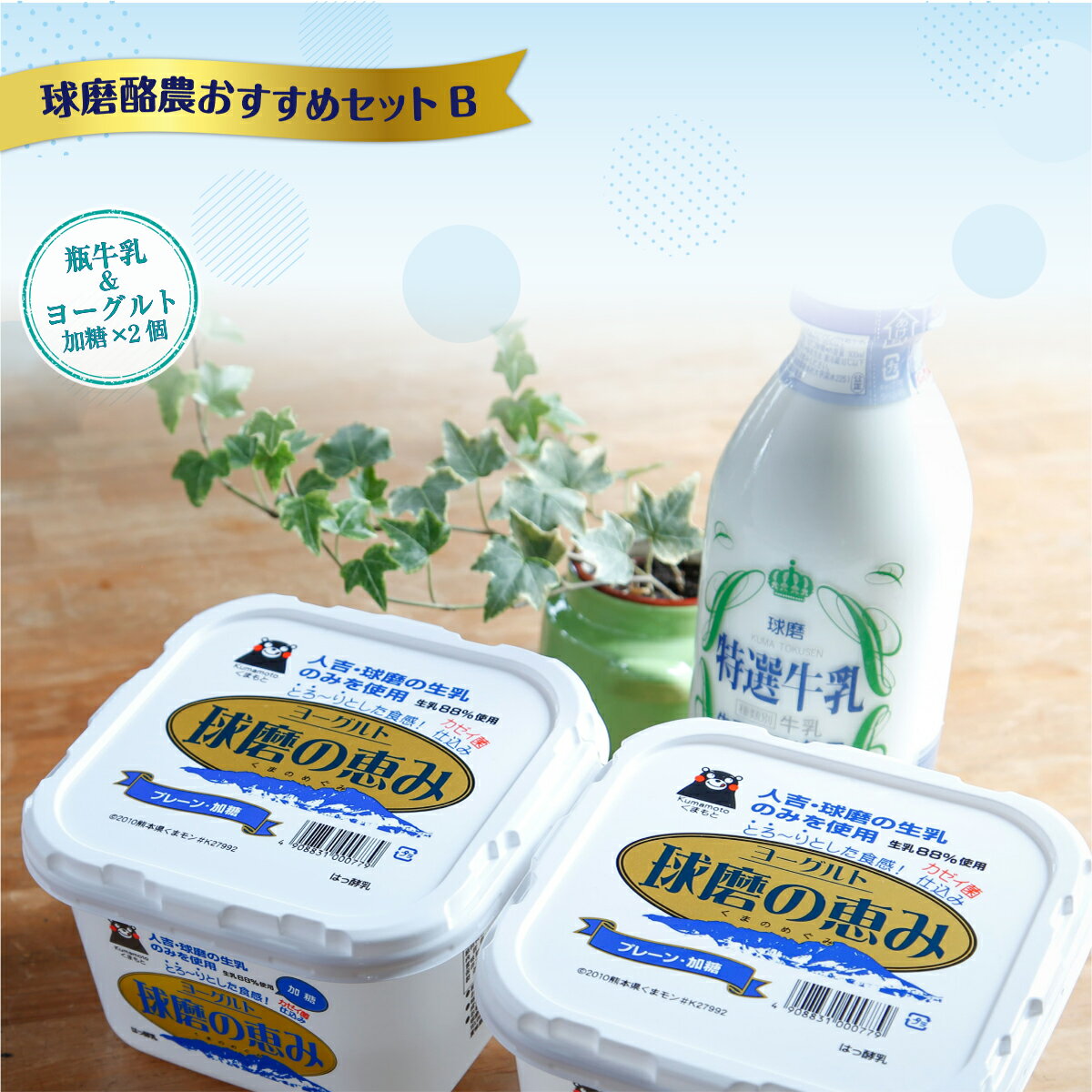 名称 球磨酪農おすすめセットB(瓶牛乳&ヨーグルト加糖×2個) 内容量 ・球磨酪農特選壜牛乳(900ml×1本) ・球磨の恵みヨーグルト加糖(1000g×2個) 原材料 ・球磨酪農特選牛乳 生乳 ・球磨の恵みヨーグルト加糖 生乳(熊本県人吉市・球磨郡産)、乳製品、砂糖、寒天/香料 賞味期限 ・牛乳:製造日より8日 ・ヨーグルト:製造日より14日 保存方法 要冷蔵、10℃以下で保存ください。