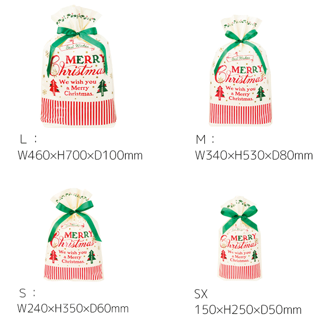 商品説明商品名クラシカルクリスマスリボン付PEギフトバッグ仕様・サイズLサイズ(1枚):W460×H700×底マチD100mm〔厚み〕0.06mmMサイズ(2枚):W340×H530×底マチD80mm〔厚み〕0.06mmSサイズ(3枚):W240×H350×D60mm〔厚み〕0.06mmXSサイズ(4枚):W150×H250×D50mm〔厚み〕0.05mm 素材ポリエチレン(ソフト):サテンリボン付 生産国日本製 ご注意事項 袋のサイズ(縦・横・底マチ)及びマチ有り・マチ無し、をご確認・ご了承の上、ご注文下さい。