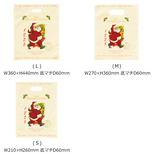 商品説明商品名クリスマスアンティークサンタ(片面デザイン) 仕様・サイズLサイズ(1枚):W360×H440mm 底マチD60mm〔厚み〕0.05mmMサイズ(2枚):W270×H360mm 底マチD60mm〔厚み〕0.045mmSサイズ(3枚):W210×H260mm 底マチD60mm〔厚み〕0.04mm 素材ポリエチレン(ハード) 生産国日本製 ご注意事項 袋のサイズ(縦・横・底マチ)及びマチ有り・マチ無し、をご確認・ご了承の上、ご注文下さい。