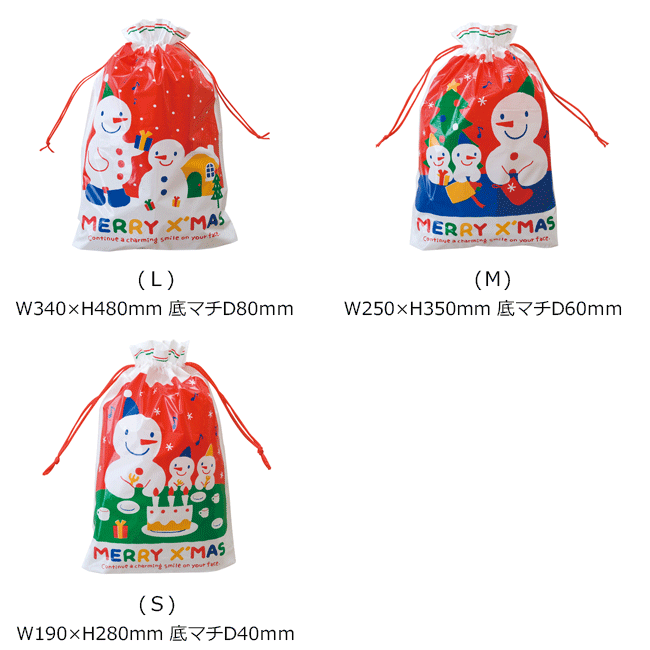 商品説明商品名スノーマンギフト巾着バッグ(片面デザイン) 仕様・サイズLサイズ(1枚):W340×H480×底マチD80mm〔厚み〕0.05mmMサイズ(2枚):W250×H350×底マチD60mm〔厚み〕0.05mmSサイズ(3枚):W190×H280×D40mm〔厚み〕0.04mm 素材ポリエチレン(ソフト) 生産国日本製 ご注意事項 袋のサイズ(縦・横・底マチ)及びマチ有り・マチ無し、をご確認・ご了承の上、ご注文下さい。